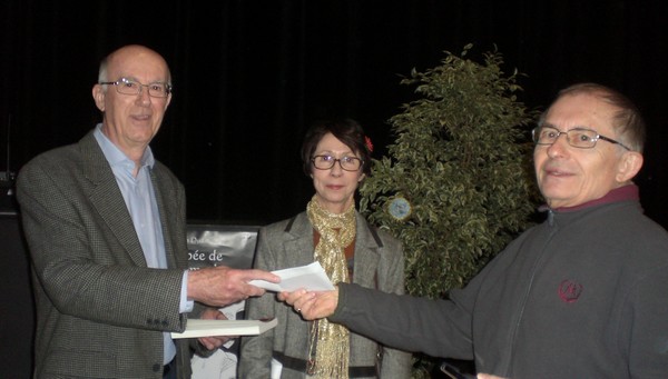 Notre trésorier Raymond Iss remet le chèque du prix Victor Hugo au lauréat.